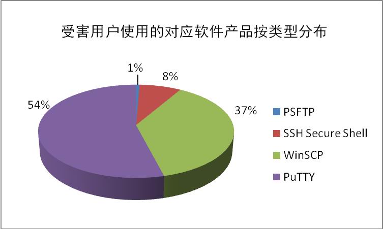 ANVA成员单位获得了记录窃取信息相关的多个数据文件,共得到27261条记信息记录。这些记录包含受害信息系统IP或域名、连接账号、连接密码、连接时间、通讯端口、对应SSH管理软件产品等信息,可直接用于发起指定信息系统主机的攻击,获得系统管理权限。根据知道创宇公司提供的信息,去除无效、重复信息后,得到受害信息系统IP或域名共1512个,当中涉及64个政府网站域名(.gov.cn)。此外,统计得到受害用户使用的SSH管理软件的分布情况如下图所示,使用Putty和Winscp的受害用户占大部分。