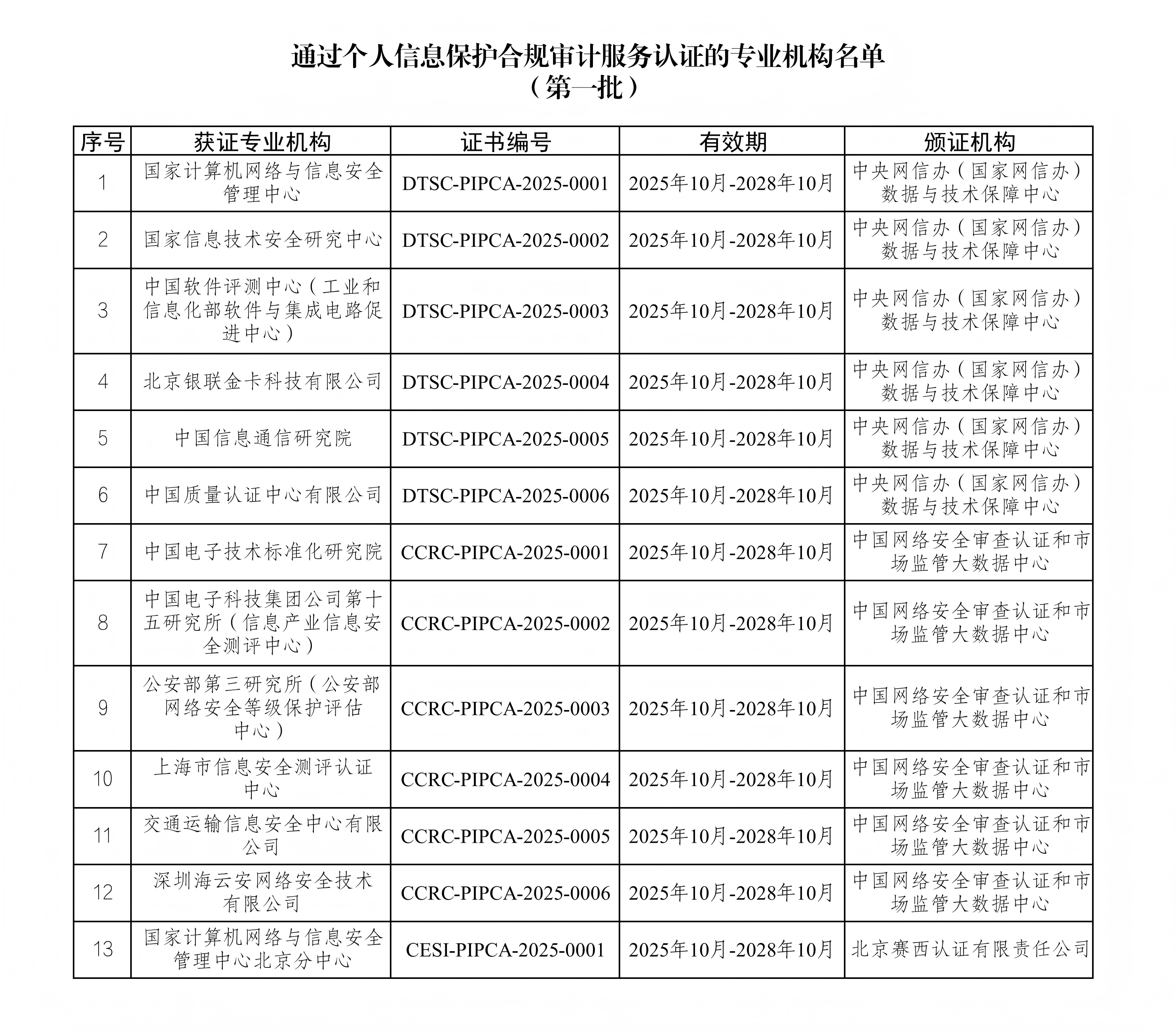 近期,首批专业机构认证工作已完成,13家机构获个人信息保护合规审计服务认证证书。具体名单如下: